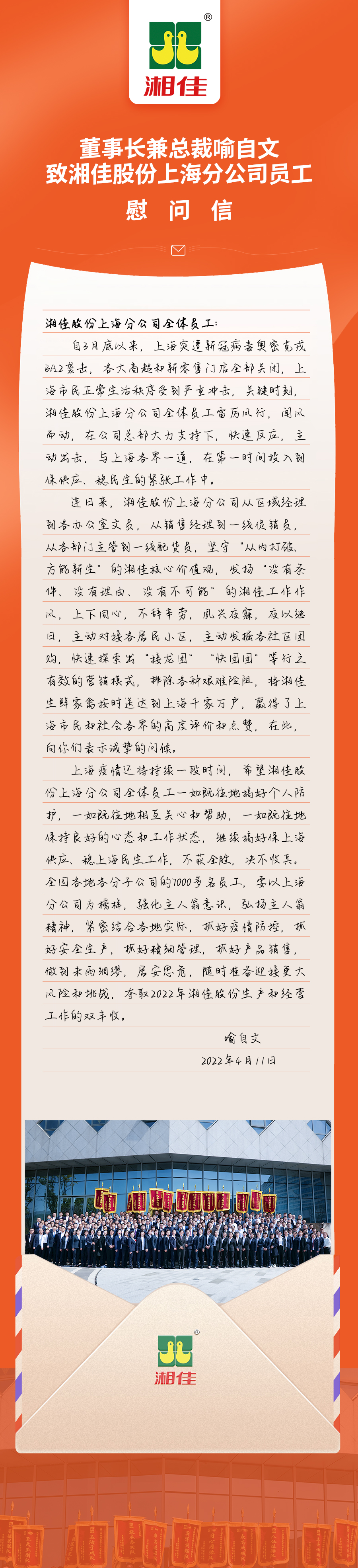 喻自文致湘佳股份上海分公司員工慰問信 發布人:文化部 發布日期:2022-04-11 5690次瀏覽 上一篇: 青春有我 筑夢湘佳|湘佳股份召開五四青年員工座談會 下一篇: 湘佳創業30周年慶祝大會:鳳領湘佳,五業齊飛