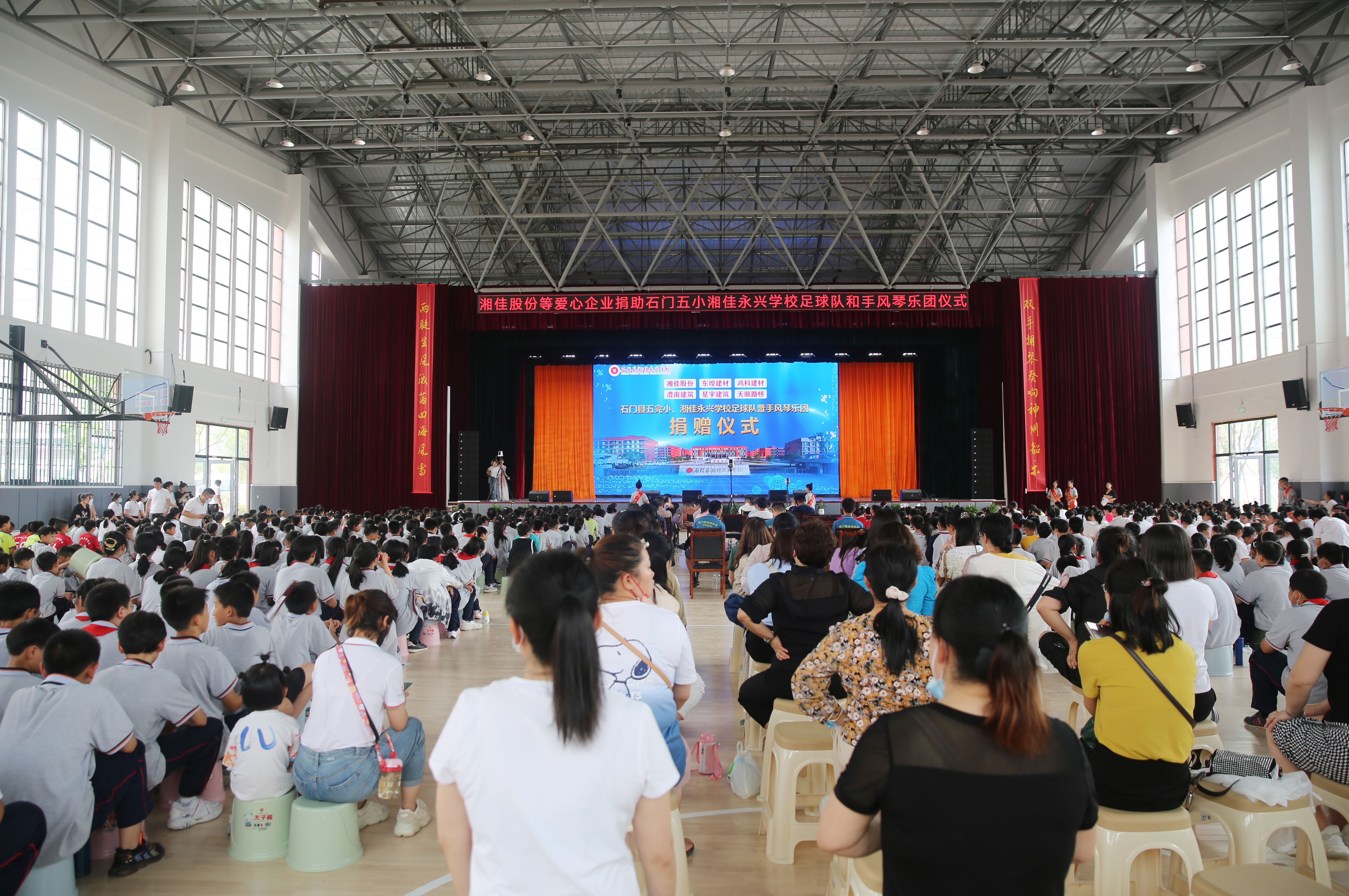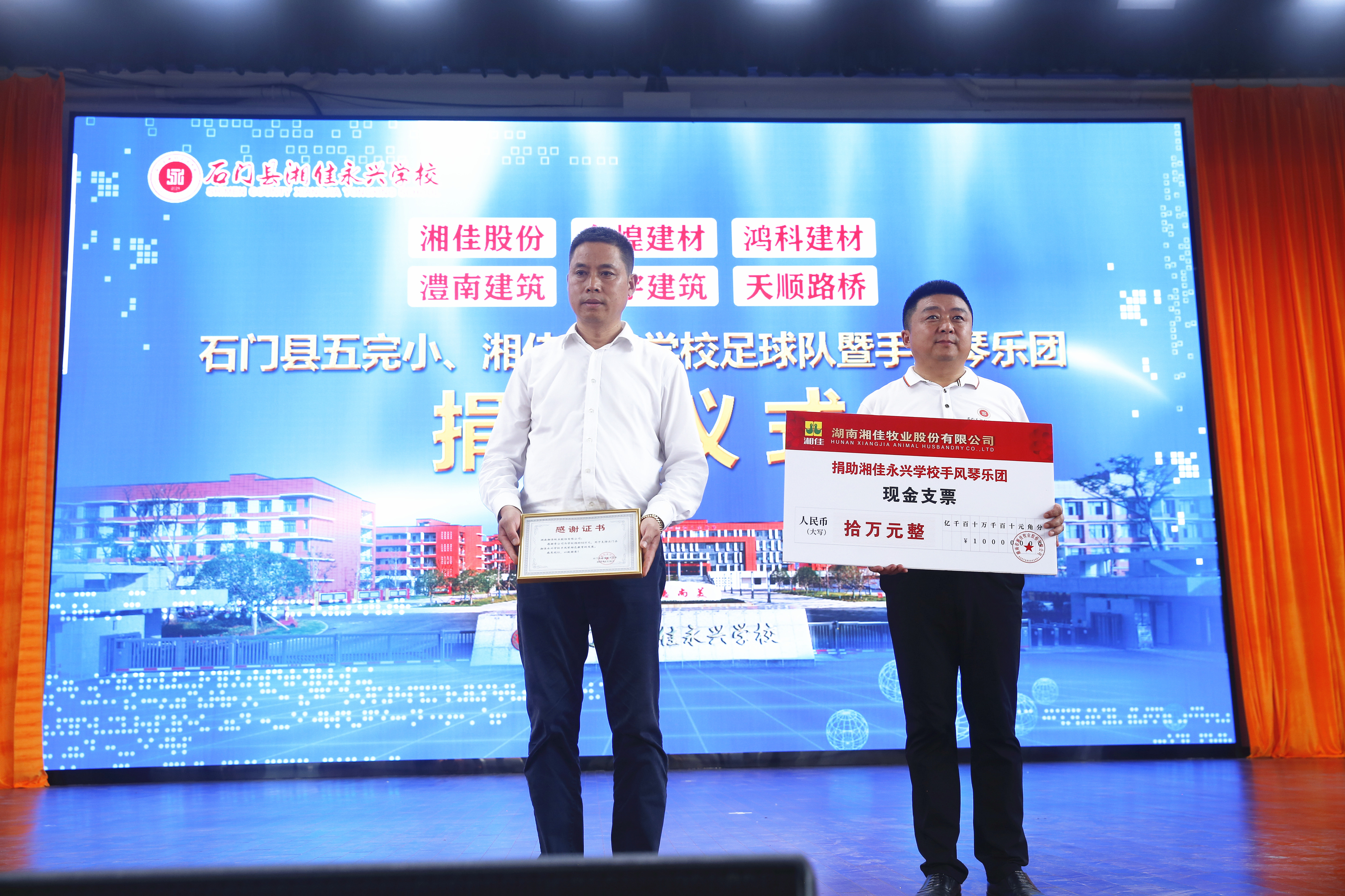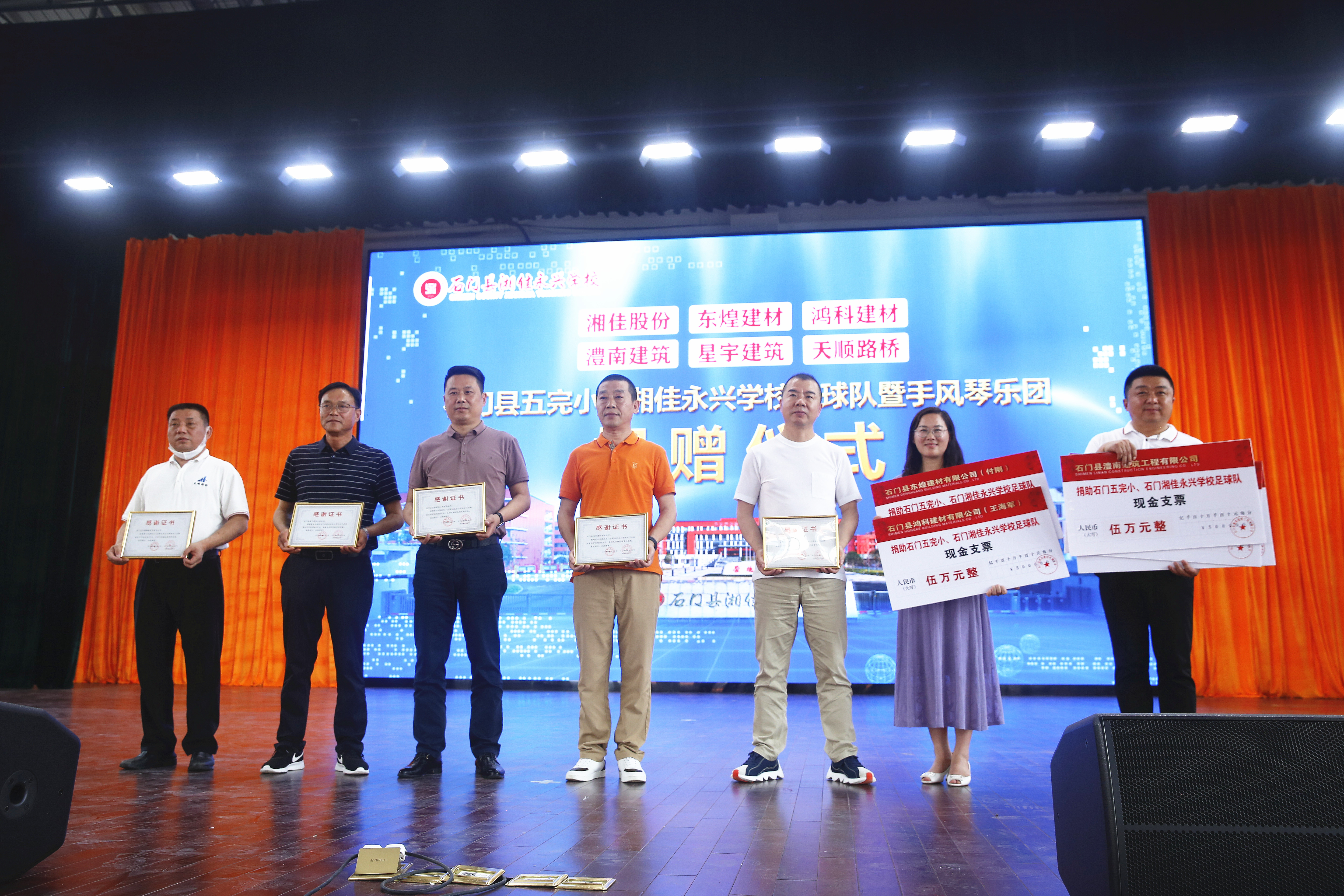 5月30日下午,湖南省石門縣五完小足球隊、湘佳永興學校手風琴樂團收到來自石門本土上市企業湘佳股份和石門本土知名企業東煌建材、鴻科建材、澧南建筑、星宇建筑、天順路橋捐贈的共計40萬元“厚禮”。